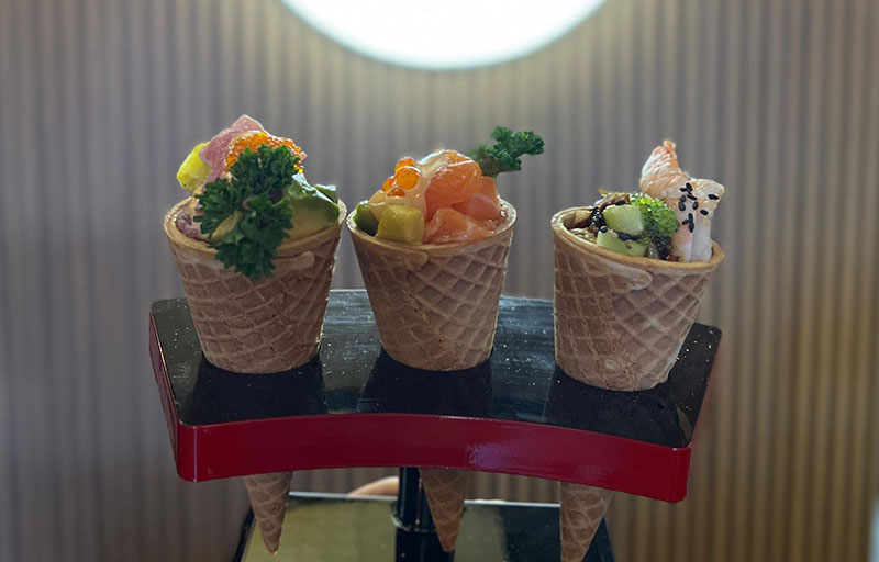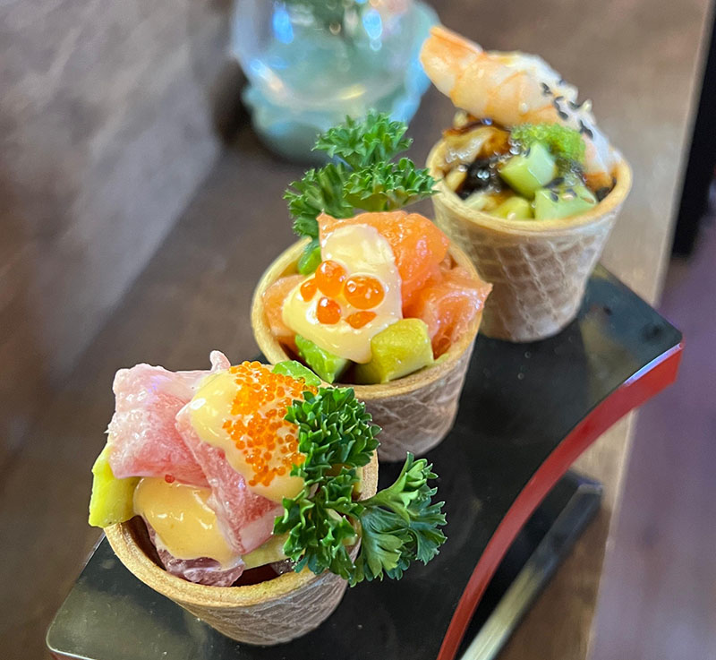 Sushi cone with three different flavors and ingredients: Salmon, masago, and avocado; Tuna, avocado, and masago; Eel, shrimp, and cucumber.