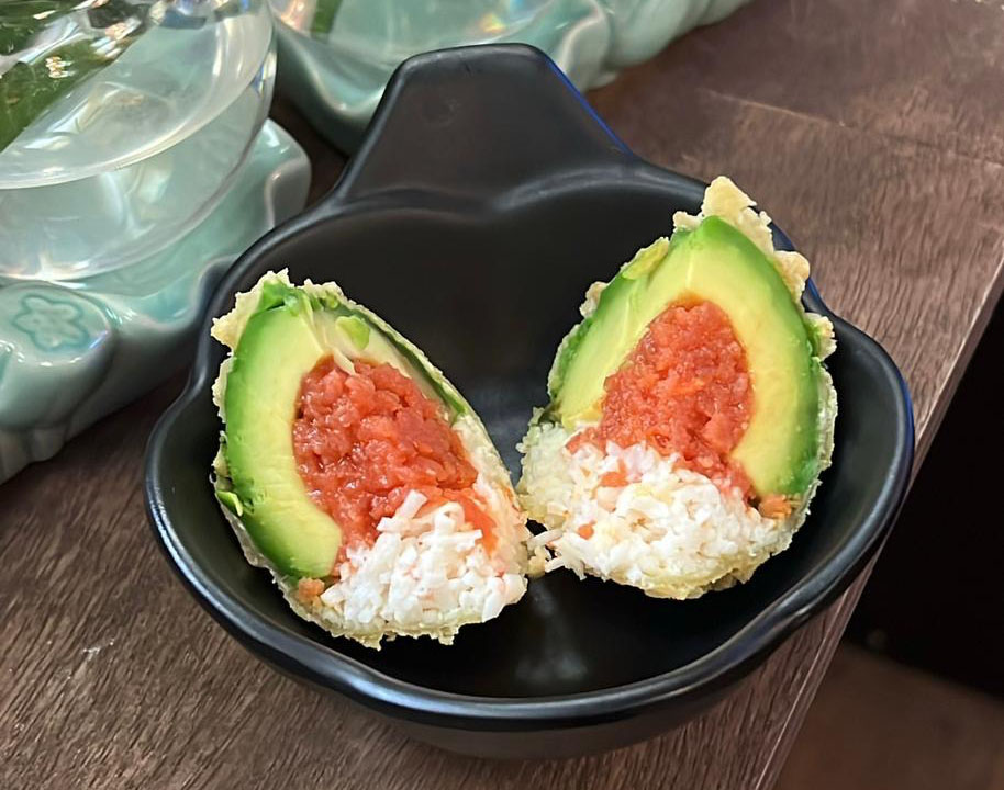 The appetizer features avocado stuffed with crab meat and spicy tuna. Disclaimer: No monkeys were harmed in the making of this dish.